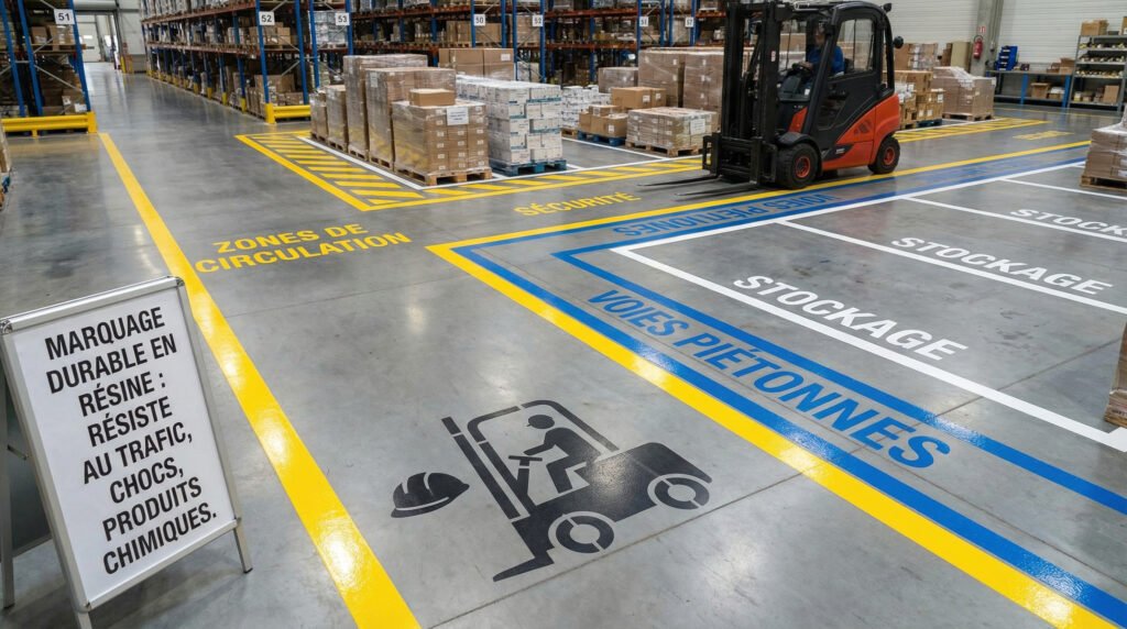 Marquage durable pour zones de circulation, sécurité, stockage, voies piétonnes ou pictogrammes industriels. Contrairement aux peintures classiques, le marquage en résine résiste mieux au trafic, aux chocs et aux produits chimiques.